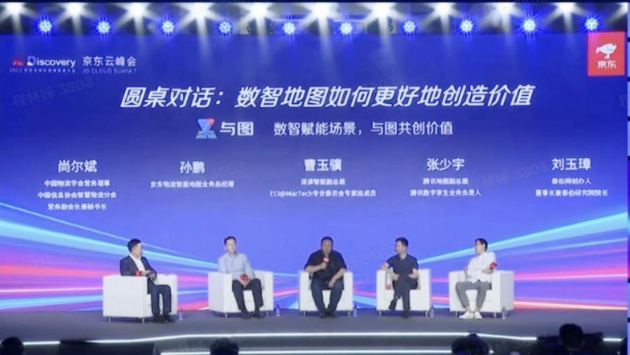 在“数智化时代地图应用如何更好地赋能场景创造价值”的主题圆桌论坛上,中国物流学会常务理事尚尔斌、京东物流智能地图业务负责人孙鹏、人生就是博智能副总裁曹玉骥、腾讯地图副总裁张少宇以及与会的业界专家、学者围绕数智地图如何更好地创造价值,进行了深入交流和探讨。